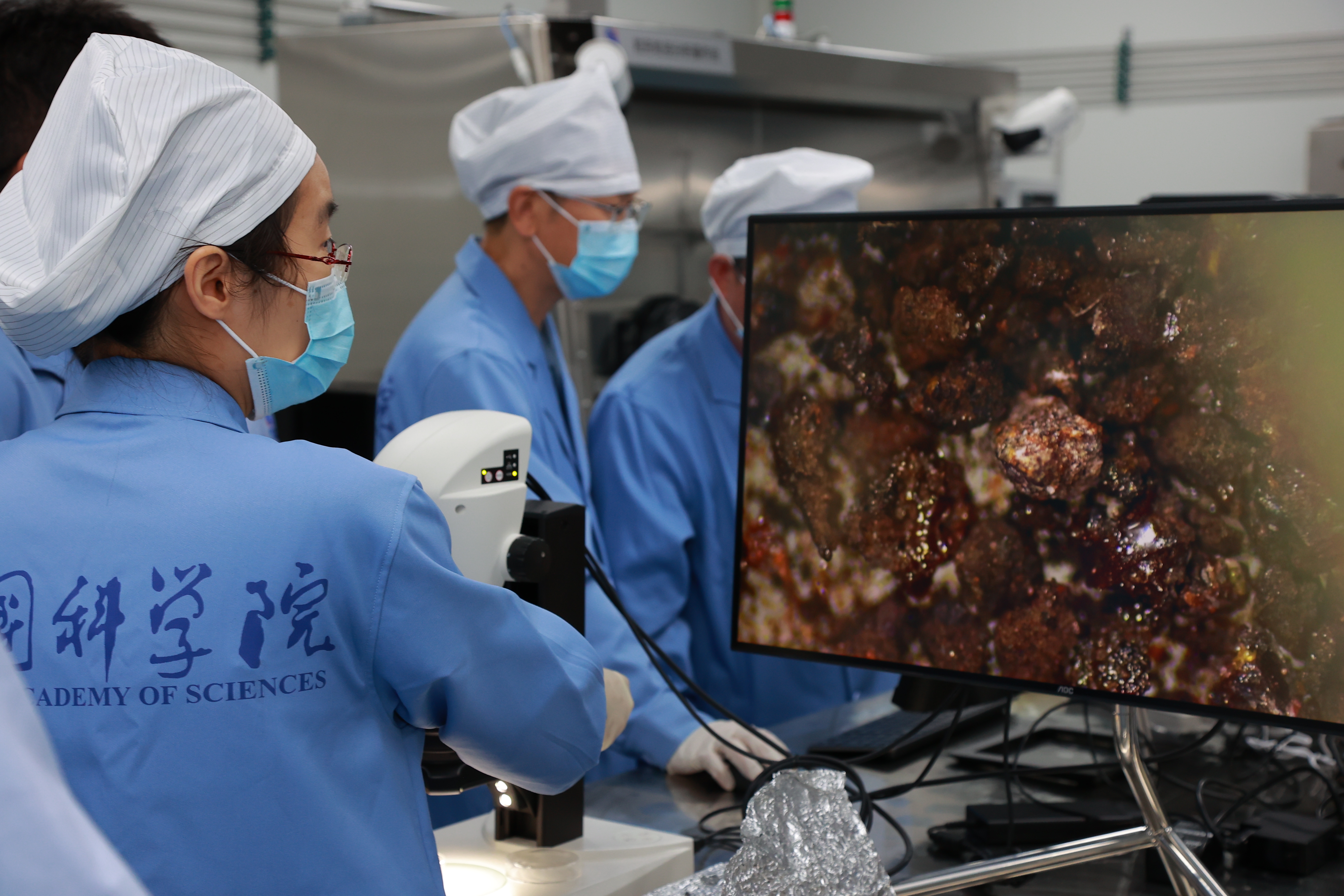 国家天文台科研人员查看岩屑显微镜成像照片
