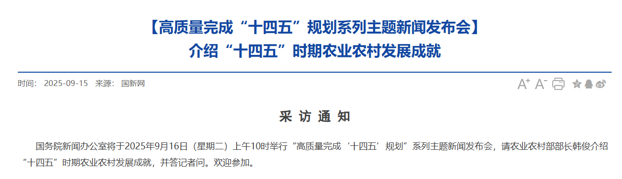 据国新网发布现货配资平台多少钱,国务院新闻办公室将于2025年9月16日(星期二)上午10时举行“高质量完成‘十四五’规划”系列主题新闻发布会,请农业农村部部长韩俊介绍“十四五”时期农业农村发展成就,并答记者问。