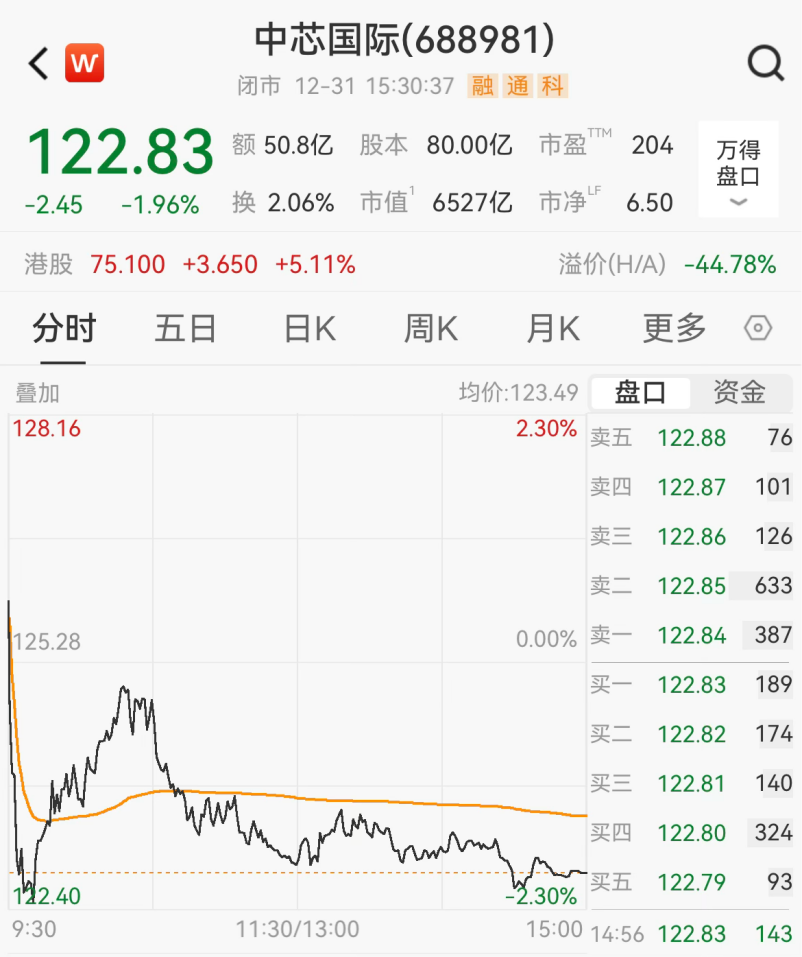 A股方面,截至2025年12月31日,中芯国际A股报122.83元/股,当日跌幅为1.96%。